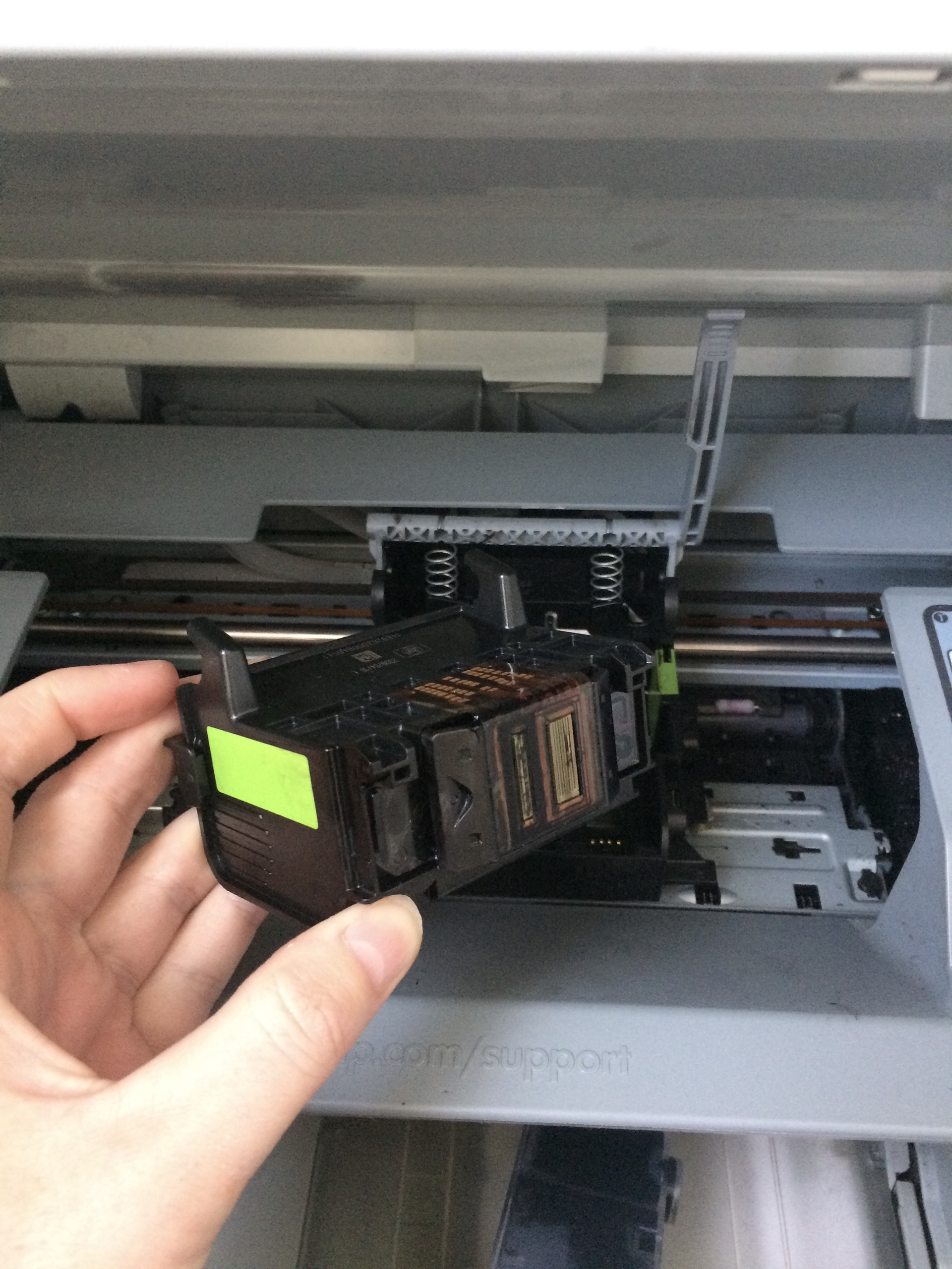 Een paar Youtube-filmpjes later had ik de printerkop gereinigd, maar toen kwam er ineens rook uit de printer. Met mijn Youtube-filmpjes-kennis was mijn conclusie dat 2 van de 5 ‘uitlaatklepjes’ van de printerkop kapot waren.